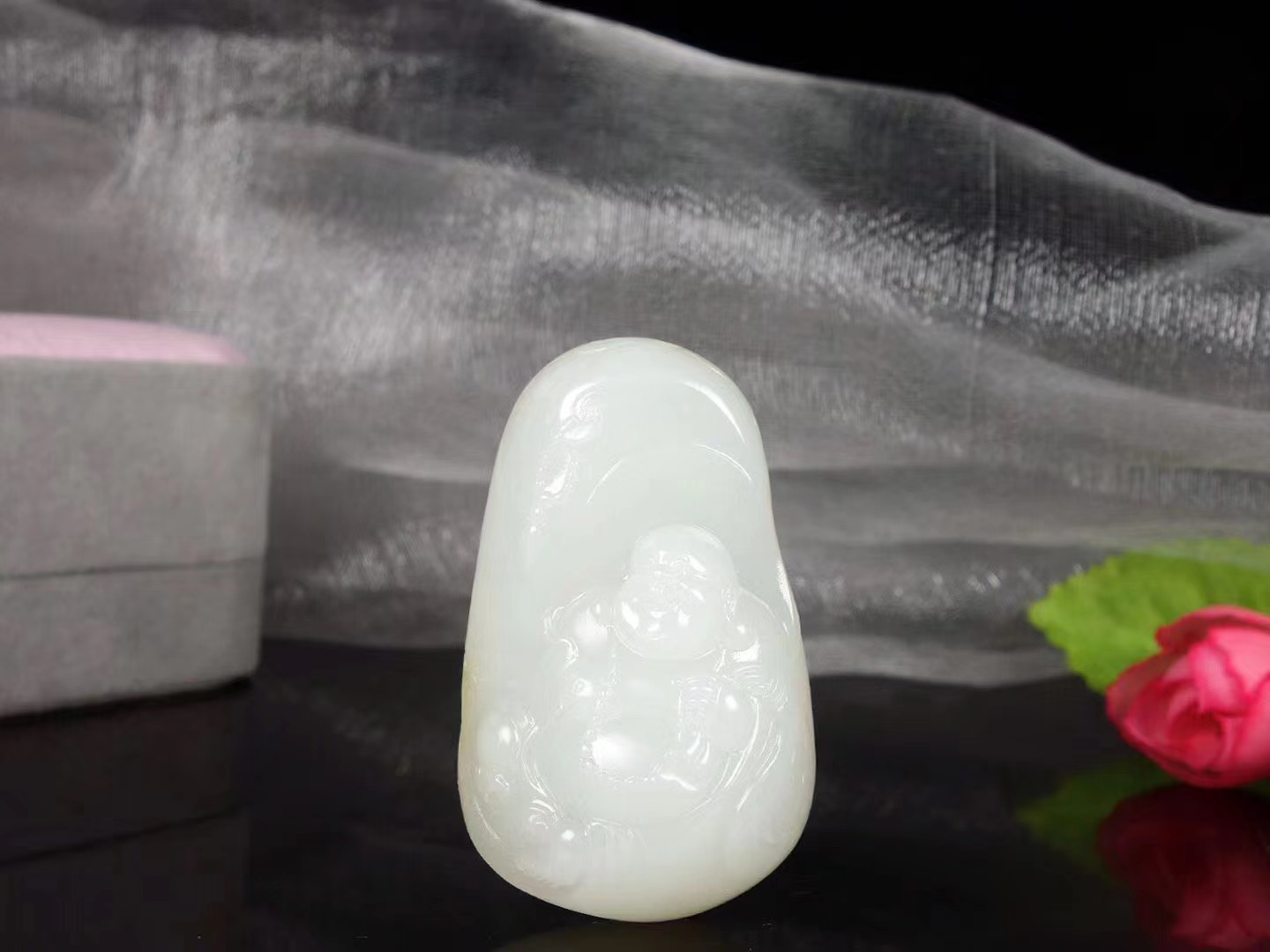 新疆和田玉籽料弥勒佛挂件 质地细腻 油份足 巧雕蝙蝠 线条流畅 精雕弥勒大耳双垂 面容中带着吉祥 和谐喜庆 雕刻十分传神 寓意平安康宁 富贵如意 財福双至 大肚能容