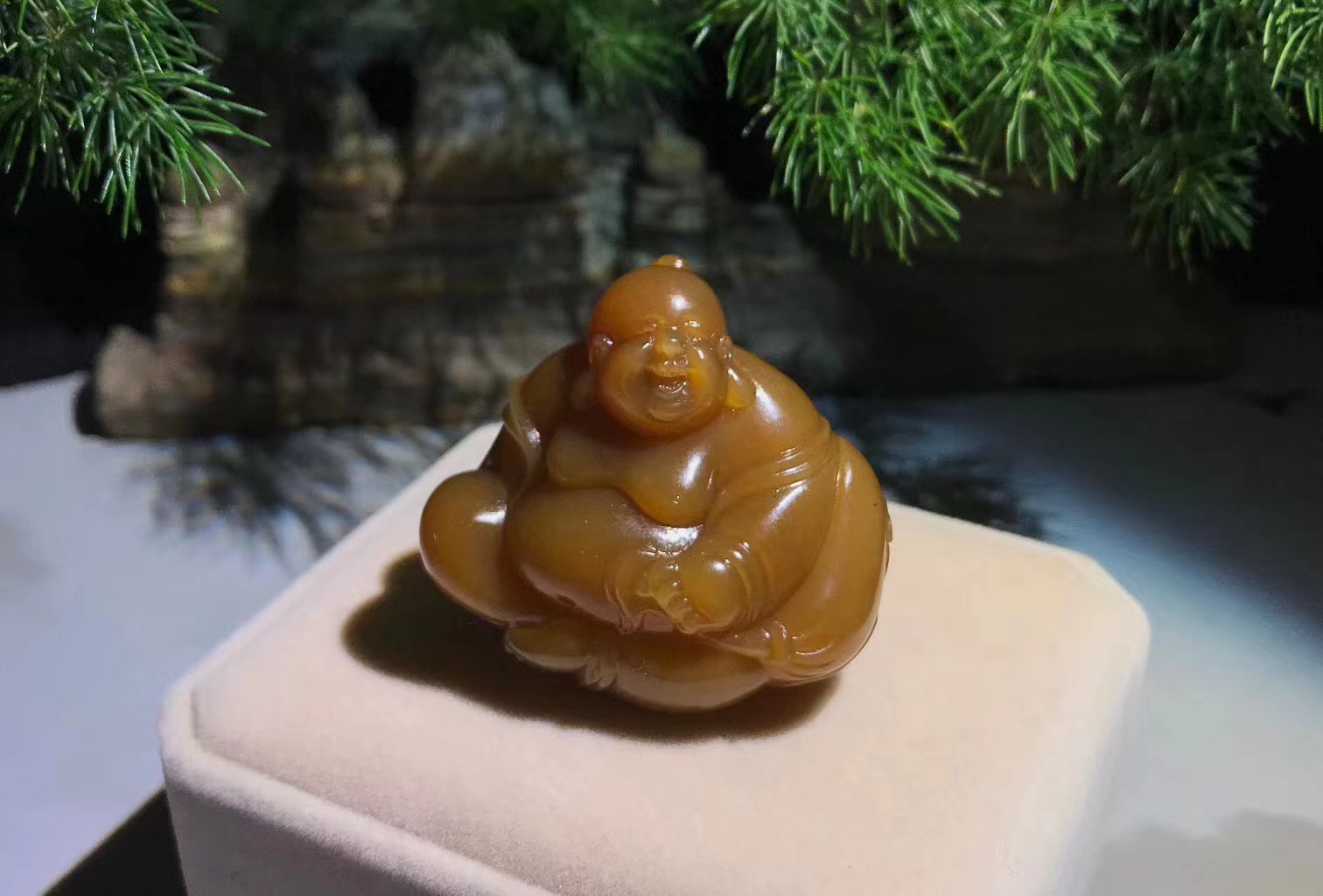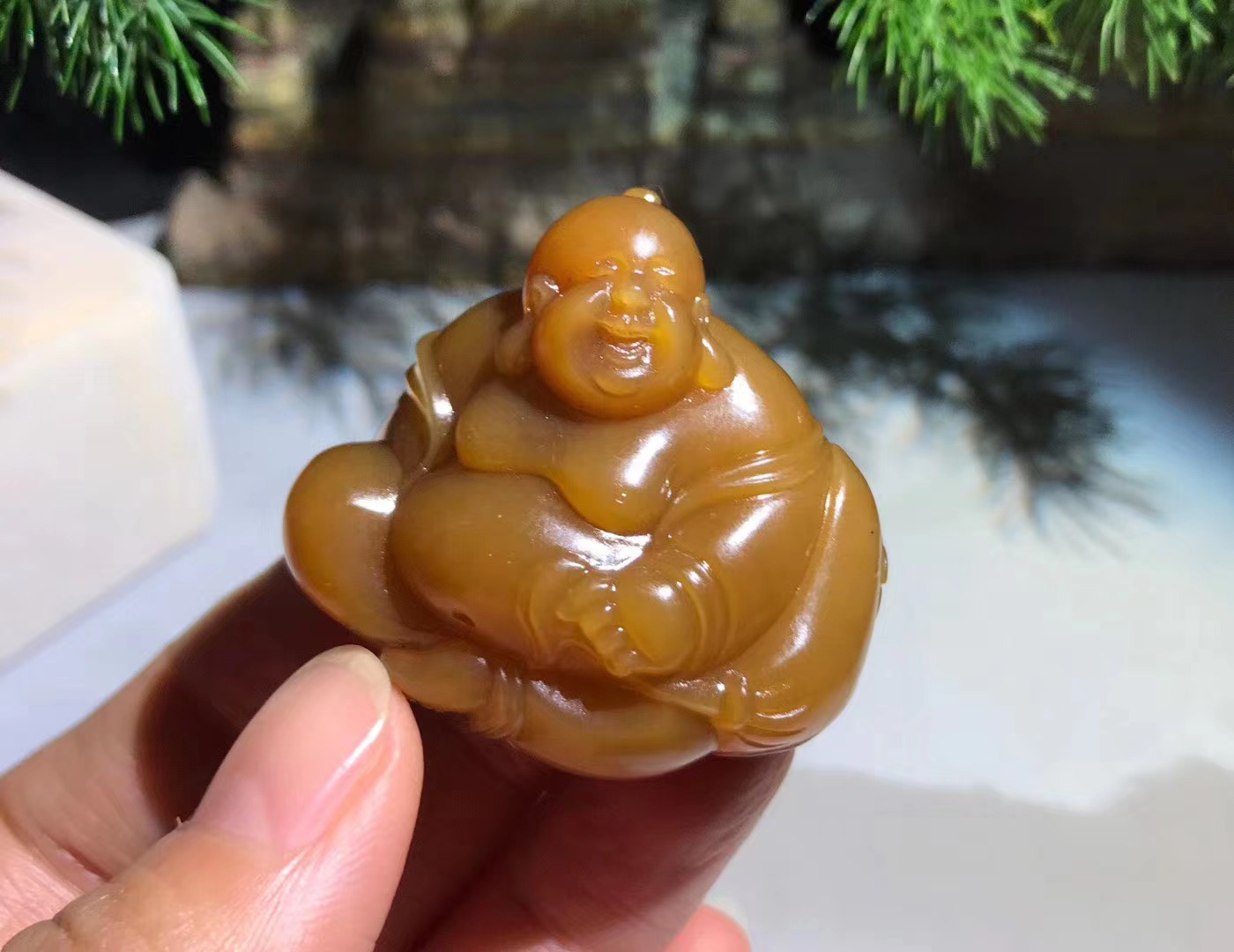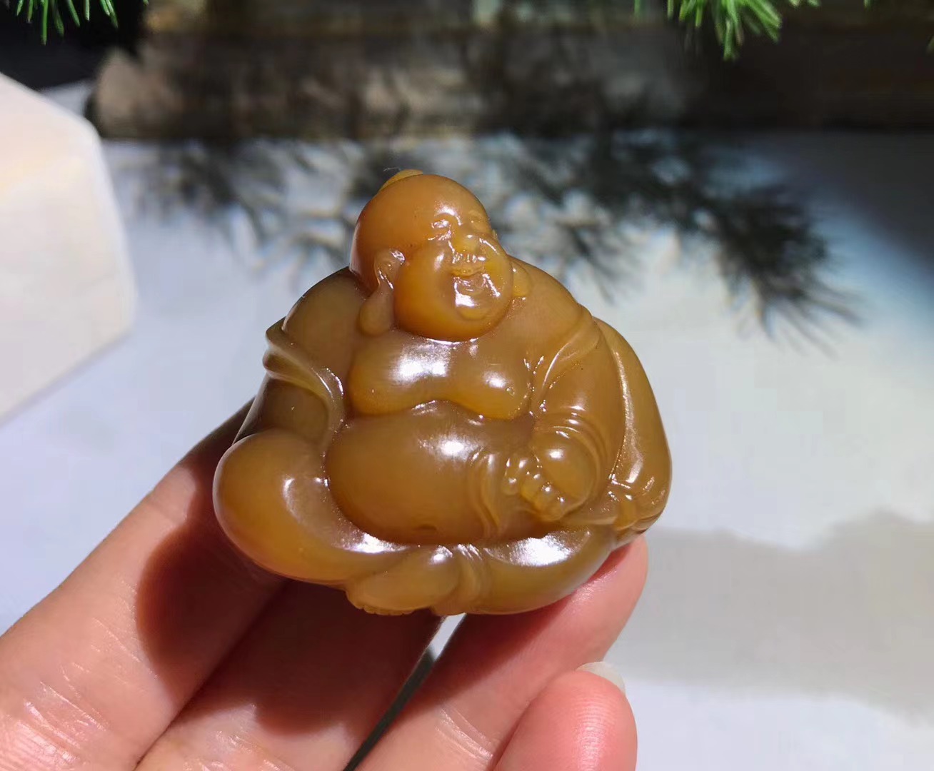 新疆和田玉且末糖玉佛引福来挂件 质地细腻 油份足 线条流畅 精雕弥勒大耳双垂 面容中带着吉祥 和谐喜庆 雕刻十分传神 寓意平安康宁 富贵如意 財福双至 大肚能容